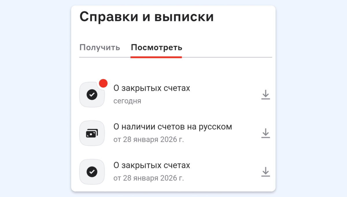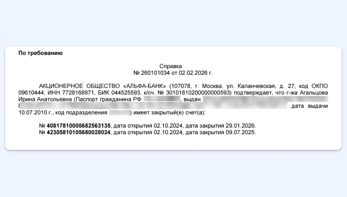 В справке, сделанной после закрытия счёта 29 января 2026 года, отсутствовала отметка, что счёт закрыт. При повторном заказе справки 2 февраля необходимая информация появилась.