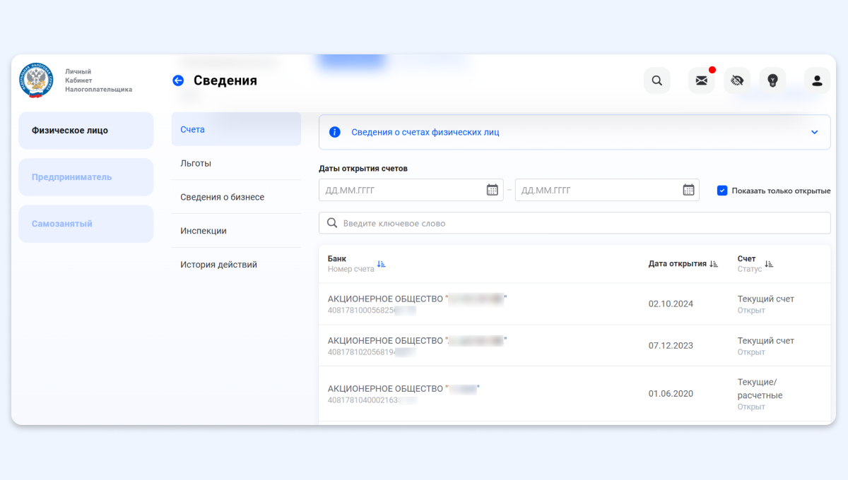 Проверить, какие счета у вас активны, можно за несколько минут. Удобнее всего сделать это в личном кабинете на сайте Федеральной налоговой службы (ФНС) — там отражаются счета во всех банках, как открытые, так и закрытые.