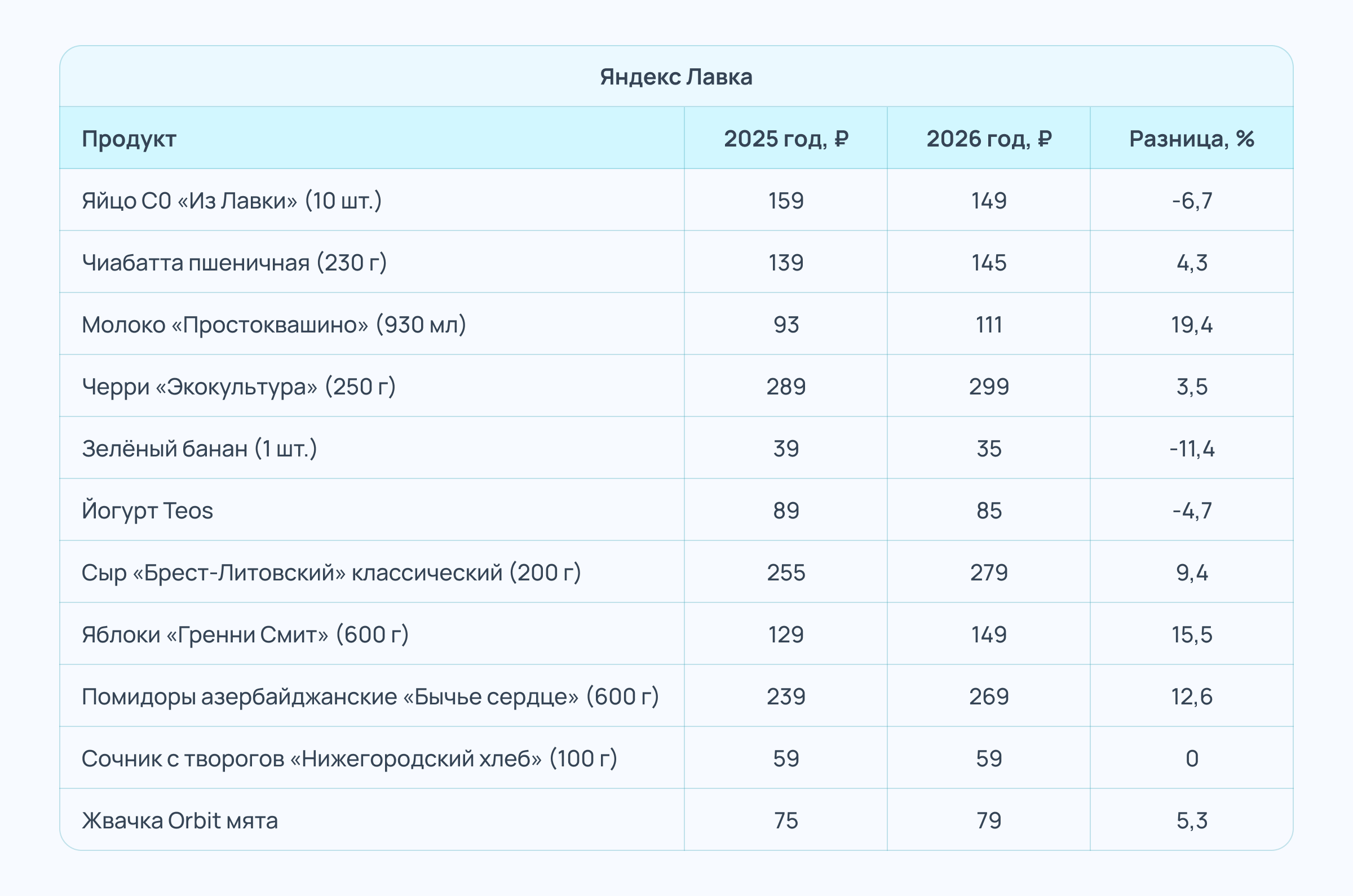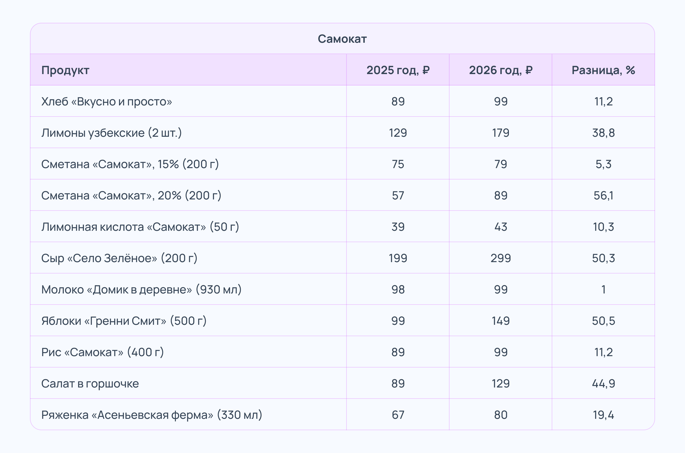 Рост цен по чекам в этом сервисе составил 27,19% за год. Особенно сильно подорожали овощи и фрукты: яблоки и салат поднялись в цене почти вдвое, лимоны — на треть. Молочные продукты показали менее резкий скачок: молоко прибавило около 1%, сметана — около 5%, однако сыры резко подорожали (+50%).
