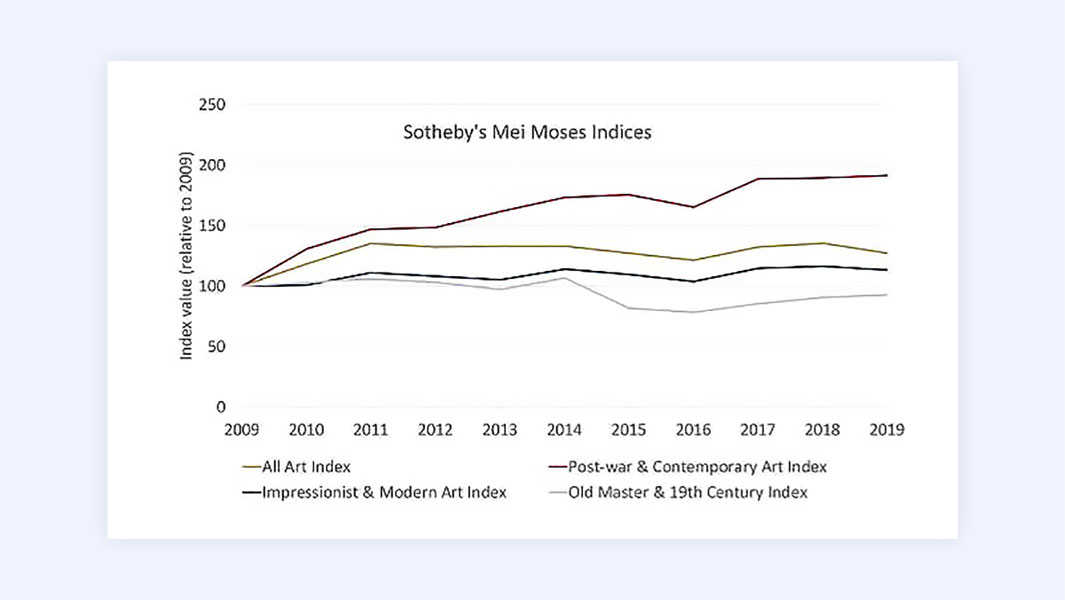 Говорить, что рынок искусства в долгосрочной перспективе «всегда растёт», как фондовый рынок, можно лишь с большими оговорками. Исторические индексы действительно показывают положительную динамику, однако у искусства нет аналогов дивидендов или корпоративных прибылей, а рост носит неравномерный характер и сильно различается по сегментам и авторам.