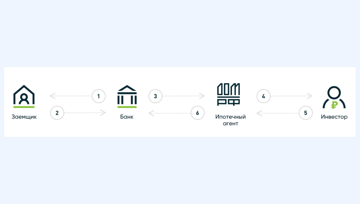- Далее банк продолжает обслуживать выданные ранее ипотечные кредиты, собирает платежи по ним и регулярно передаёт денежные потоки ипотечному агенту.
