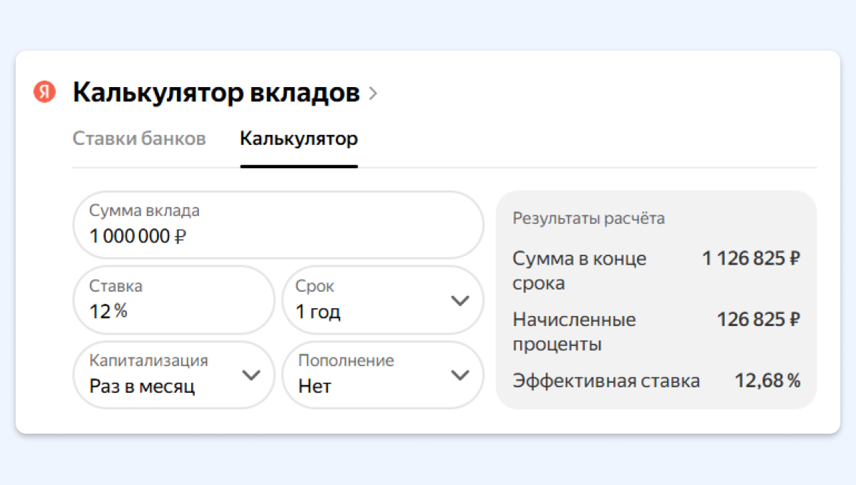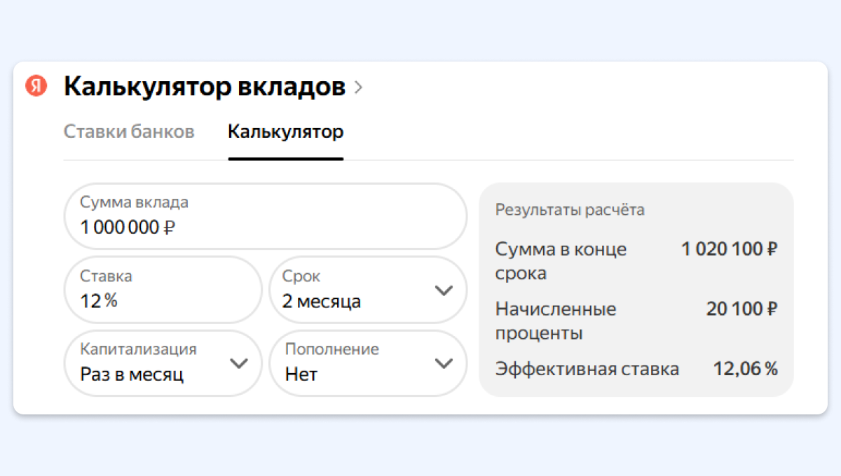 - Условия начисления процентов. Сравнивайте не только ставки, но и доходность — она учитывает способ начисления процентов. Например, вклад с ежемесячной капитализацией под 10% будет выгоднее, чем депозит под 11% с выплатой процентов в конце срока.