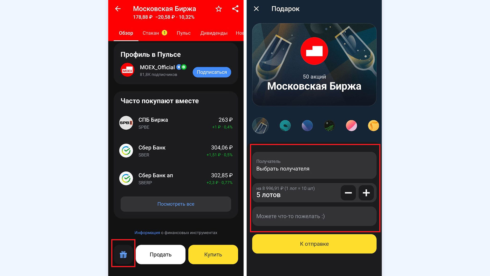 Такая функция есть, например, в приложении брокера Т-Инвестиции. Важно, чтобы и даритель, и получатель подарка были клиентами брокера. Чтобы сделать кому-то презент, выберите акцию, нажмите значок подарка возле кнопки «Купить», введите число бумаг, номер получателя и напишите поздравление.