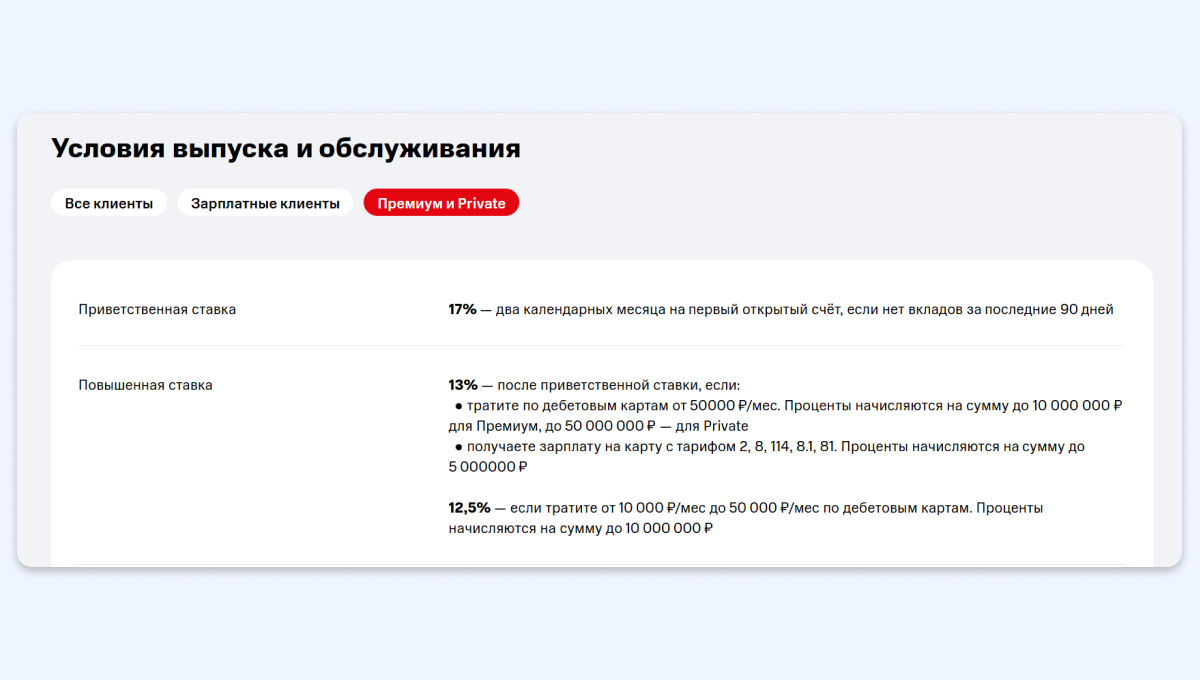 - Дополнительные условия. Помимо приветственных надбавок, есть и другие. Их банки предлагают за выполнение определённых условий. Например, в МТС Банке повышенные ставки могут получить зарплатные клиенты банка, клиенты с премиум-подпиской, а также те, кто тратит по картам определённую сумму денег.