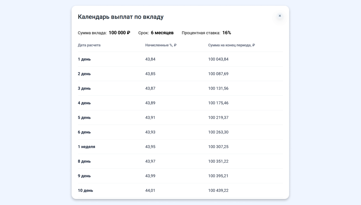 Например, если вы положите 100 тысяч на накопительный счёт под 16%, то с ежемесячной выплатой через полгода ваш доход составит 8201 рубль, а с ежедневной выплатой — 8256 рублей. Сумма несущественная, но это всё же больше, чем в первом варианте.