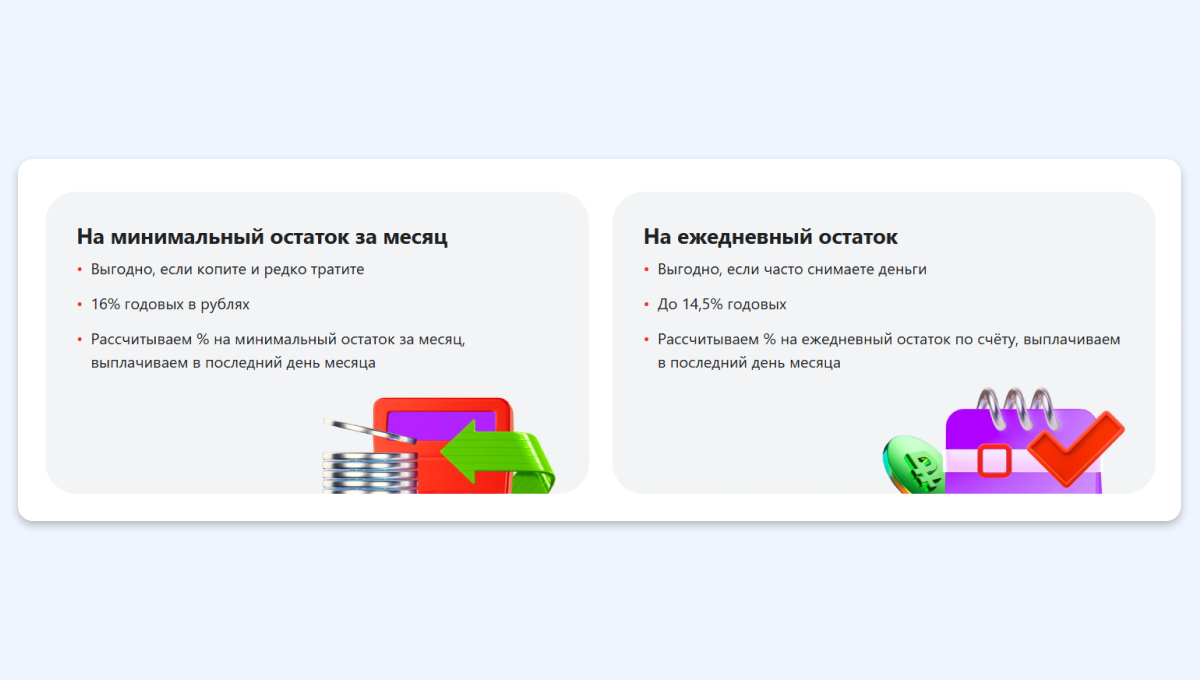 Первая особенность заключается в разном подходе к начислению процентов: одни банки начисляют их на минимальную сумму за месяц, другие — на сумму на конец каждого дня. Вот как это работает: