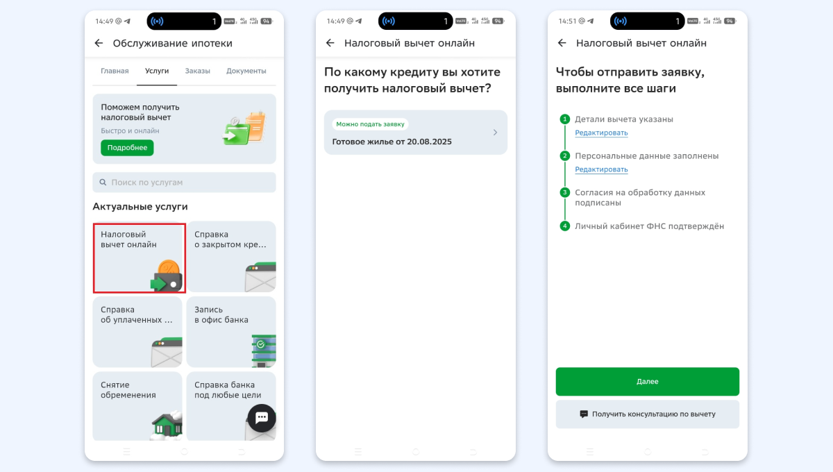 Например, если вы оформляли ипотеку в Сбере, подать заявление на вычет можно в приложении Домклик. Для этого зайдите в раздел «Услуги», выберите «Налоговый вычет онлайн», уточните, по какому кредиту делаете возврат, и следуйте указаниям системы.