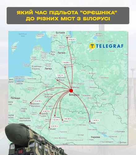 Издание Telegraf подсчитало, что время подлёта «Орешника» из Беларуси до Киева составит полторы минуты. До Львова— почти 2,5 минуты. Столько же до Варшавы и Латвии, чуть дольше — до Эстонии.