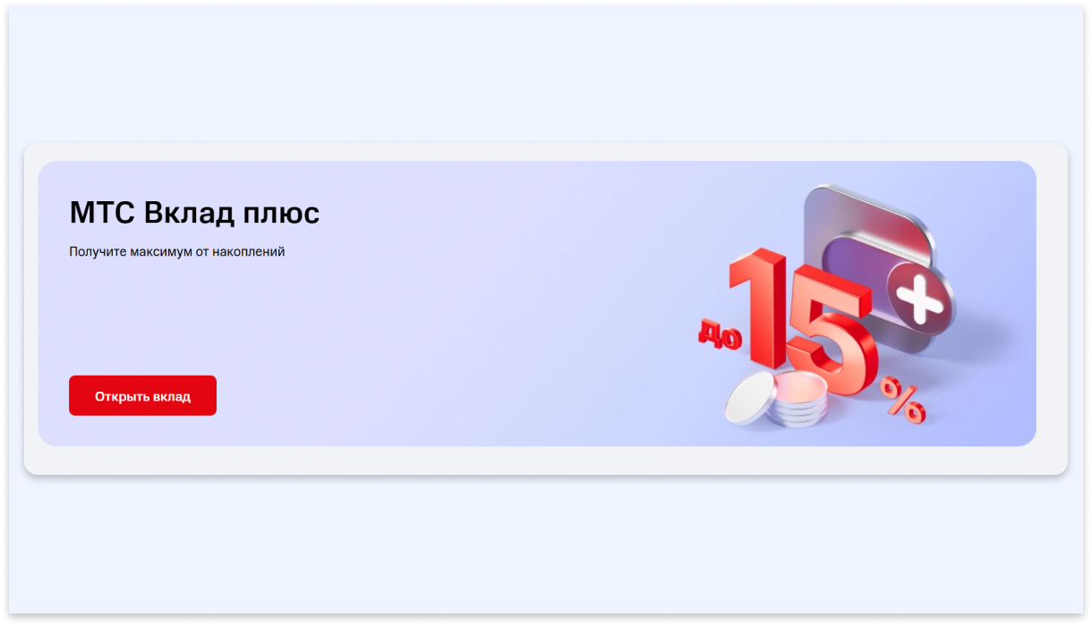 У МТС Вклад плюс базовые ставки находятся в диапазоне 11–14,5% в зависимости от срока размещения средств и способа выплаты процентов. Максимальную ставку 15% можно получить, если у вас подключён один из пакетов услуг банка: Premium, Silver line, Private banking.