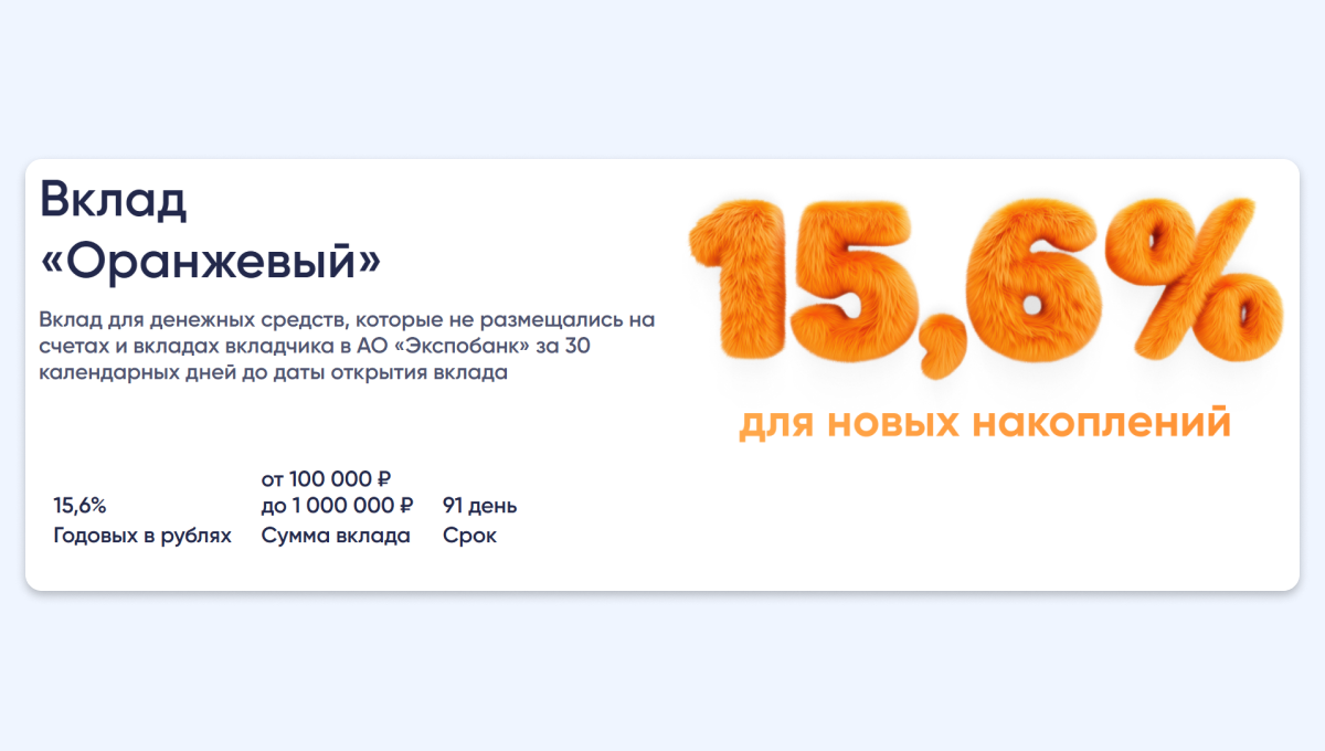 Вклад со ставкой 15,6% доступен клиентам, которые не размещали деньги в Экспобанке в течение последних 30 дней. Открыть его можно в любом офисе банка — нужен только паспорт. Единственный доступный срок размещения средств — 3 месяца. Проценты начисляются в конце срока. Один клиент может иметь не более одного «Оранжевого» вклада.