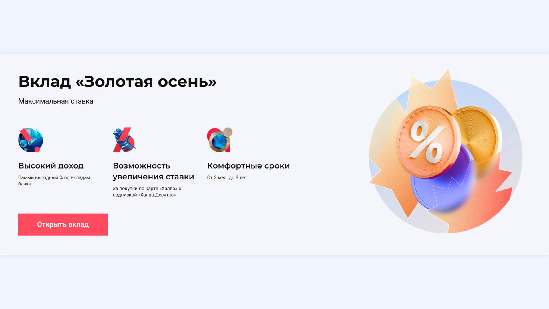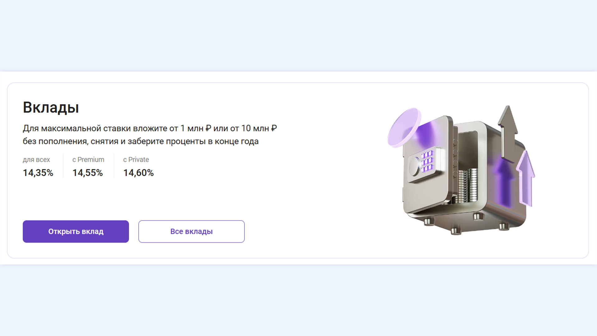 Вклад предлагает ставки до 14,35% годовых в рублях и до 2,18% в юанях на сроки от трёх месяцев до трёх лет. Проценты можно получать ежемесячно или в конце срока. Для премиальных клиентов и клиентов с крупной суммой предусмотрены надбавки.