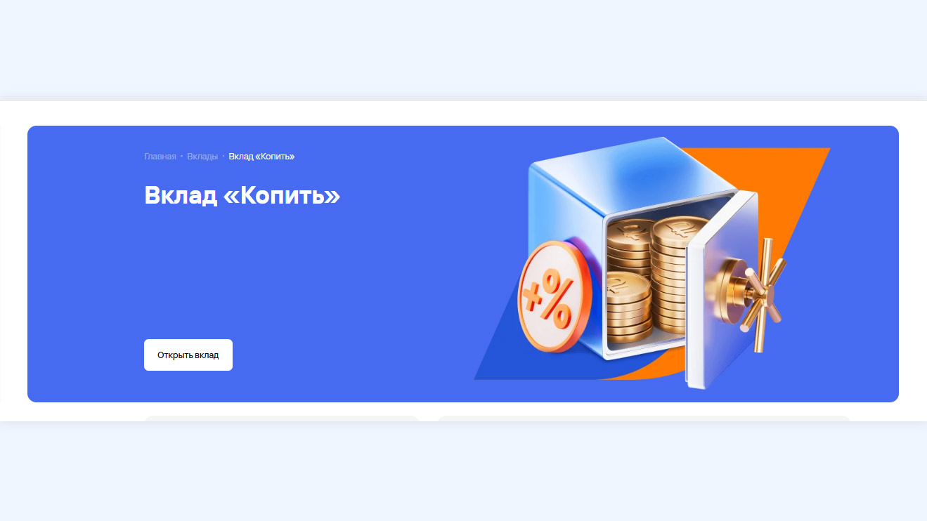 Минимальная сумма: 10 тысяч рублей при открытии онлайн и 50 тысяч — через офис.